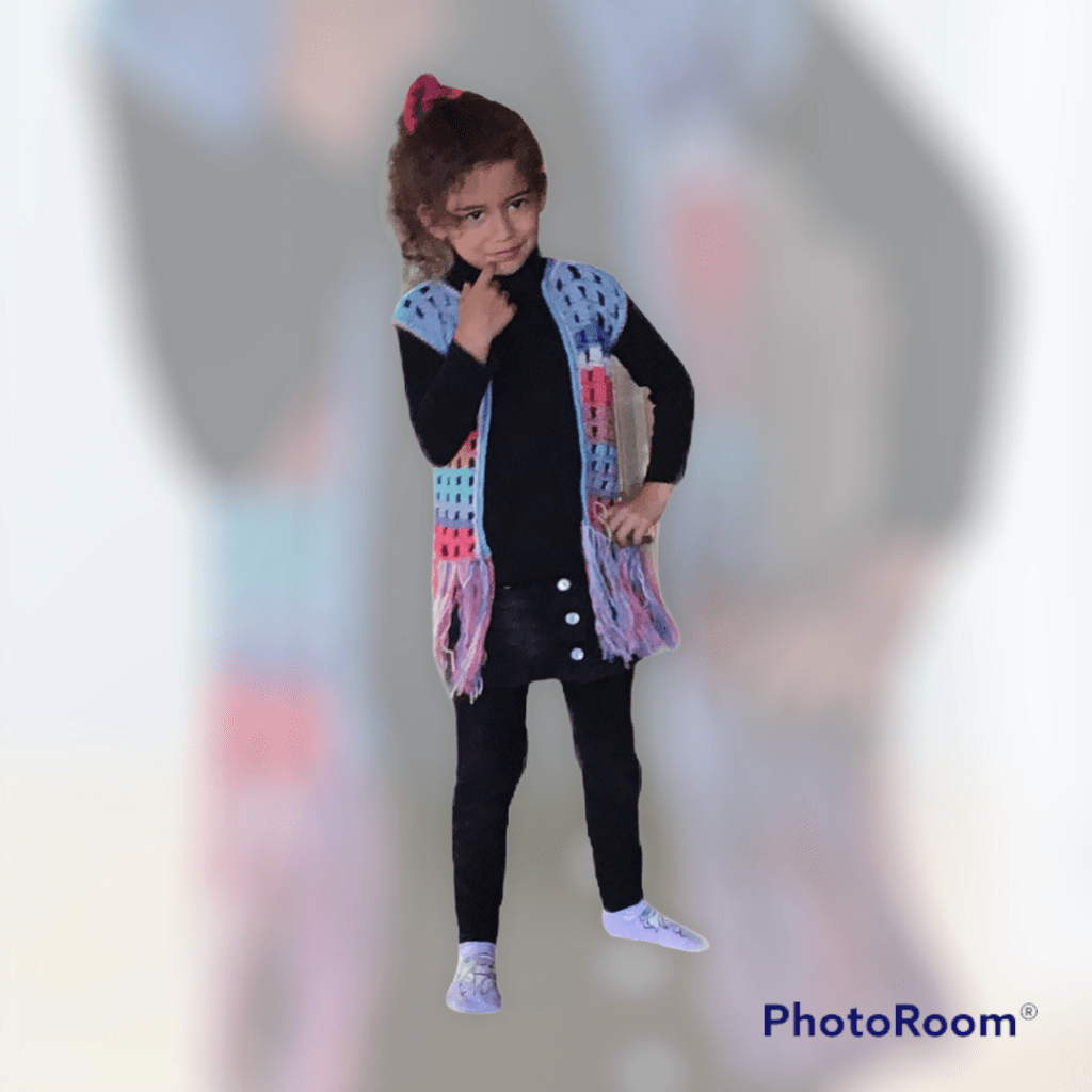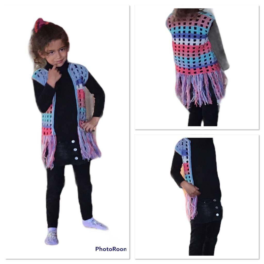 De maten zijn 122/128 en 134/140. Breedte op de rug ca 33 en 36 cm. Lengte 38 41 cm. De franje komt er nog bij, ca 10 cm.