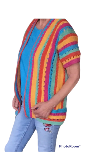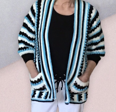 Dit vest wordt aan 1 stuk gehaakt in de lengte, dus van links naar rechts ipv beneden naar boven. De mouwen worden aangehaakt. Langs de voorpanden komt nog een brede bies.