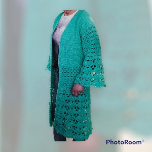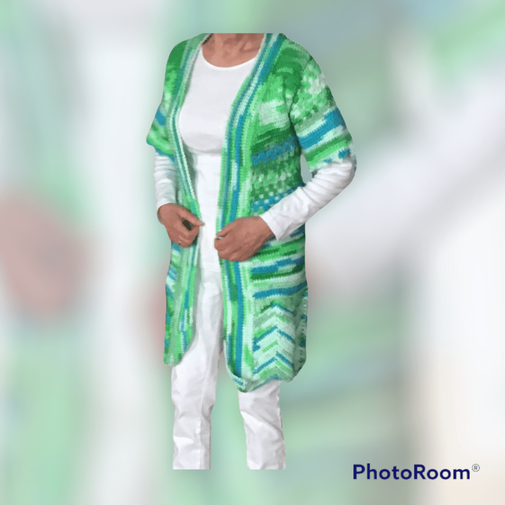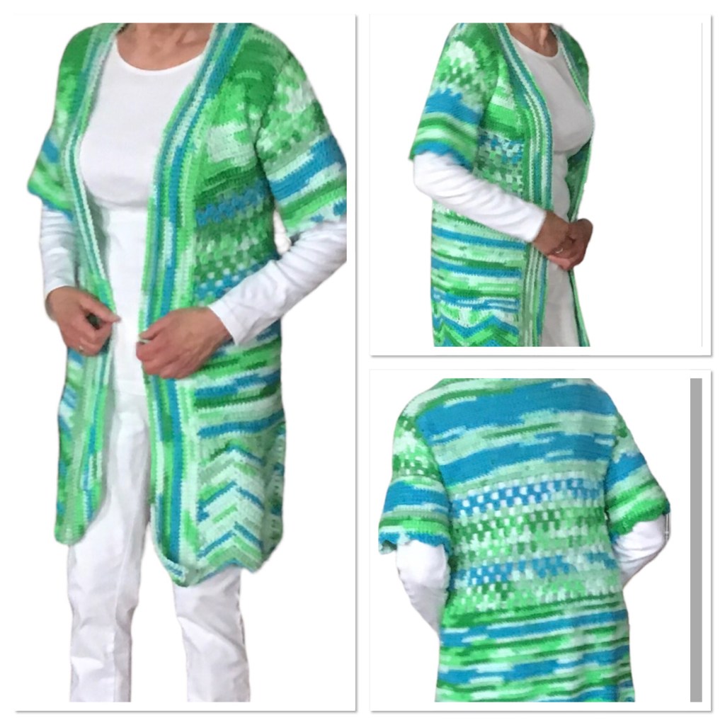 De maten zijn 36/38 40/42 en 44/46 48/50 52/54. Breedte op de rug ongeveer 50 54 58 62 66 cm. Lengte 80 a 84 cm, afhankelijk van de maat. Je kunt de lengte aanpassen. Staat in het patroon.