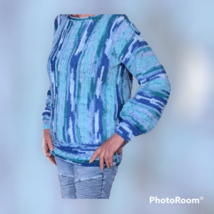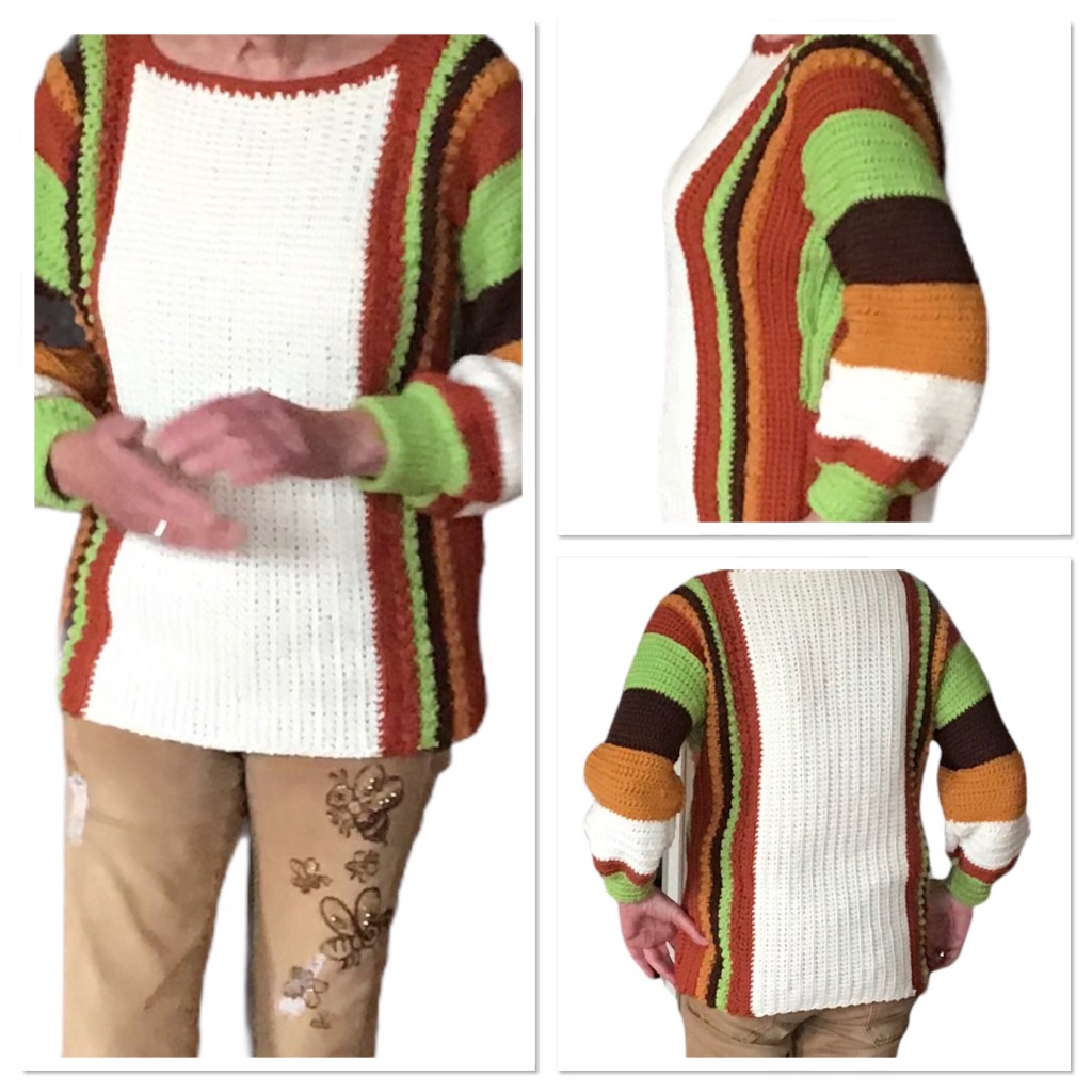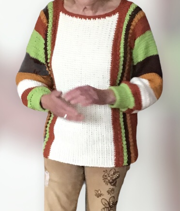 Een trui om in te wonen! Heerlijk ruimvallend en warm. Hij wordt helemaal in de lengte aan elkaar gehaakt in vasten. Achteraf hoef je alleen de ondermouwnaden en zijnaden nog te sluiten.