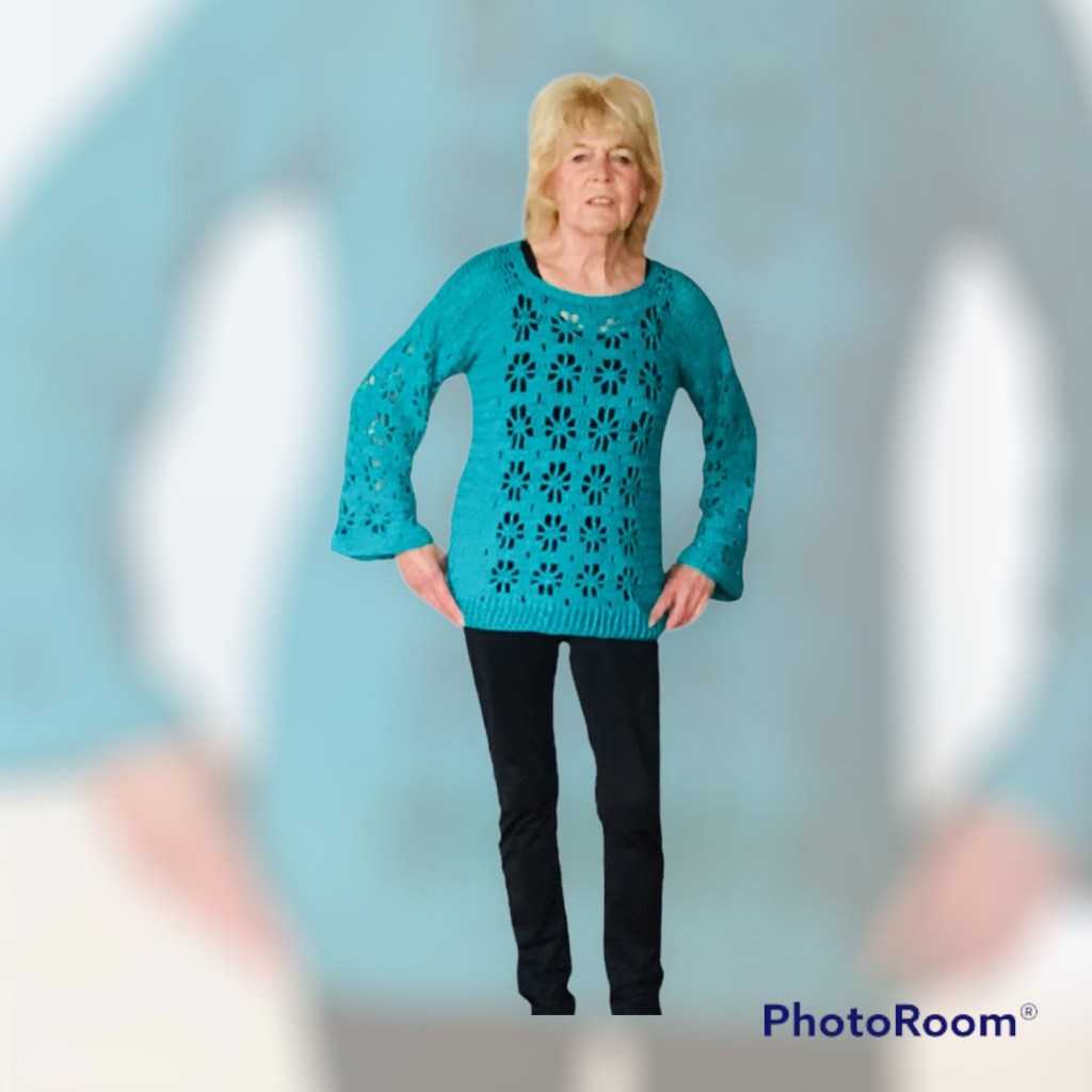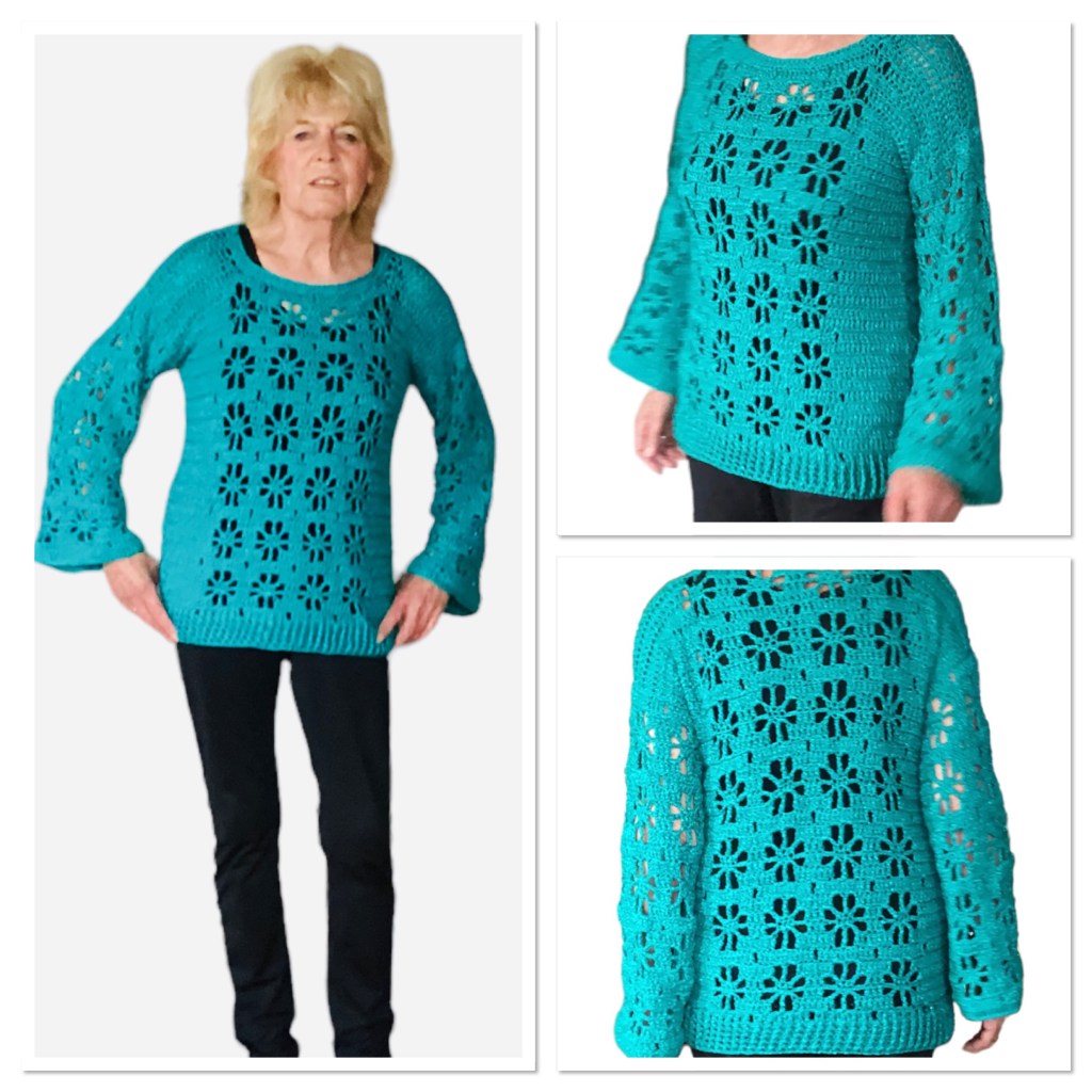 Ik heb dit truitje gehaakt met 4 bollen Sparkly Cake van de Action op Nld 5. Prijs 2,99 euro, 375 m. Voor de kleinste maat hou je een grote rest over. Je kunt natuurlijk haken met elk garen dat geschikt is voor Nld 5.