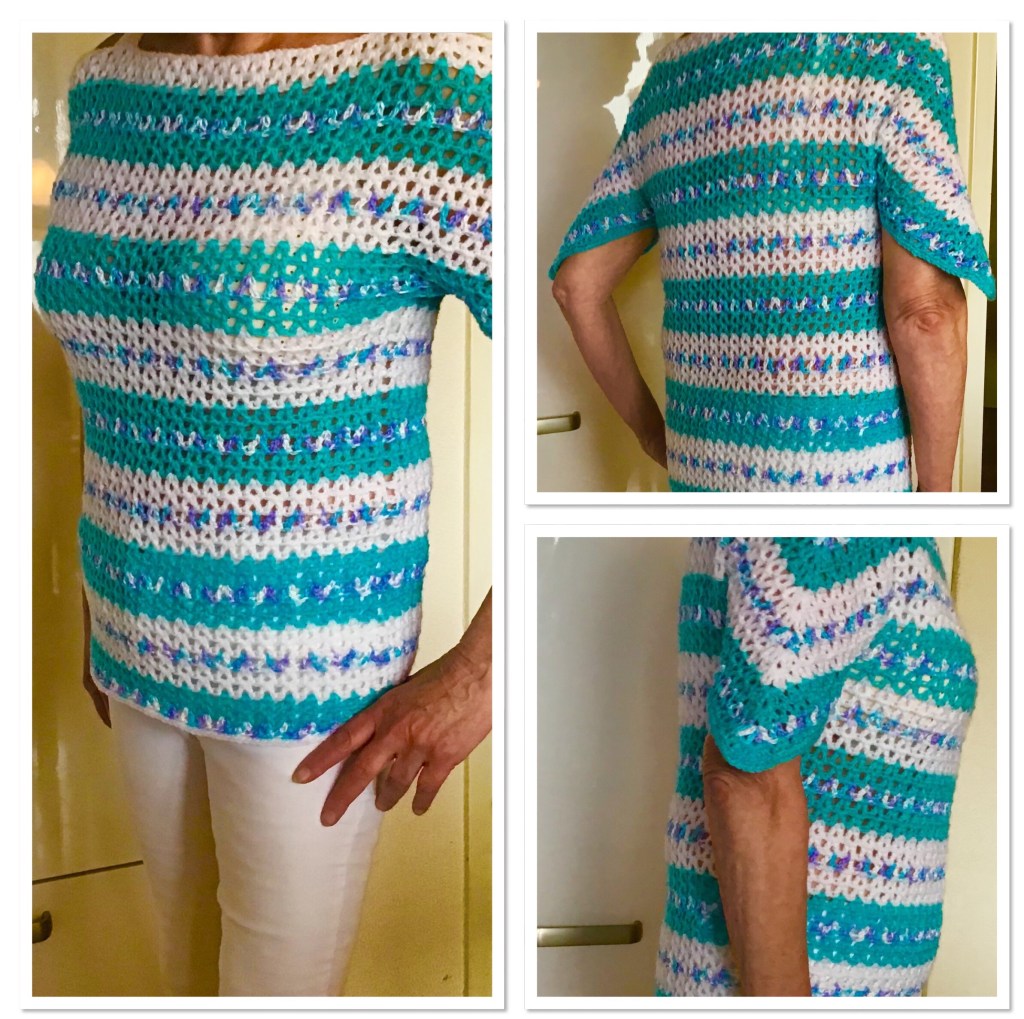 Gehaakt in v-steek, eenvoudige steek, de kleurtjes doen de rest. Van boven naar beneden gehaakt. Maten 36/46. Met Supersoft van de Zeeman en een rest gekleurd garen.