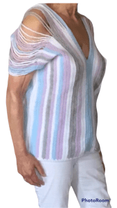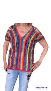 Dit truitje wordt gehaakt in de lengte en bestaat uit 2 lange banen, die later aan elkaar gezet worden. Ik heb gehaakt met 4 bollen Supersoft van de Zeeman met Nld 3,5. Voor maten 44/46 en 48/50 5 bollen, 52/54 6 bollen. Je kunt natuurlijk ook werken met dunne katoen, maar let dan wel op de meters. Supersoft is 200 m.