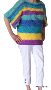 Ik heb dit truitje gehaakt op Nld 4 met Impact 3,5 van Phildar. Overgenomen op internet, Corona weet je wel. Het garen is heel mooi van kleur en het resultaat is ook prima, maar het splijt erg en dat is lastig haken. Supersoft van de Zeeman is een prima alternatief. Zeeman heeft ook een nieuw katoen garen met de goede dikte, O.a. Ella en nog een andere die toen ik dit patroon maakte niet op de website stond.
