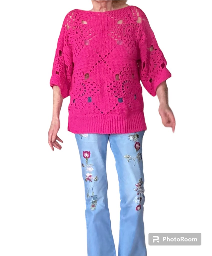 Dit truitje wordt vanuit het midden gehaakt. Ik heb gewerkt met Supersoft van de Zeeman, maar je kunt elk garen en elke dikte gebruiken, omdat het patroon in cm is ipv aantal steken.