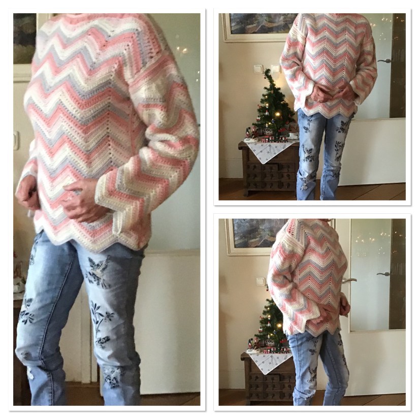 Lekkere warme trui. Gemaakt met 5 bollen Fay van de Zeeman. Patroon in maten 36/46. Grotere maten op aanvraag. Prijs patroon 2,50.