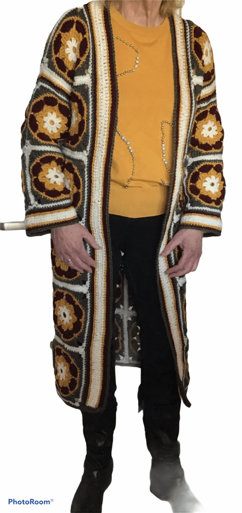 Het vest bestaat uit vierkantjes, waar later een brede bies aan wordt gehaakt. Hoe je de vierkantjes moet haken zie je op instructiefoto’s.