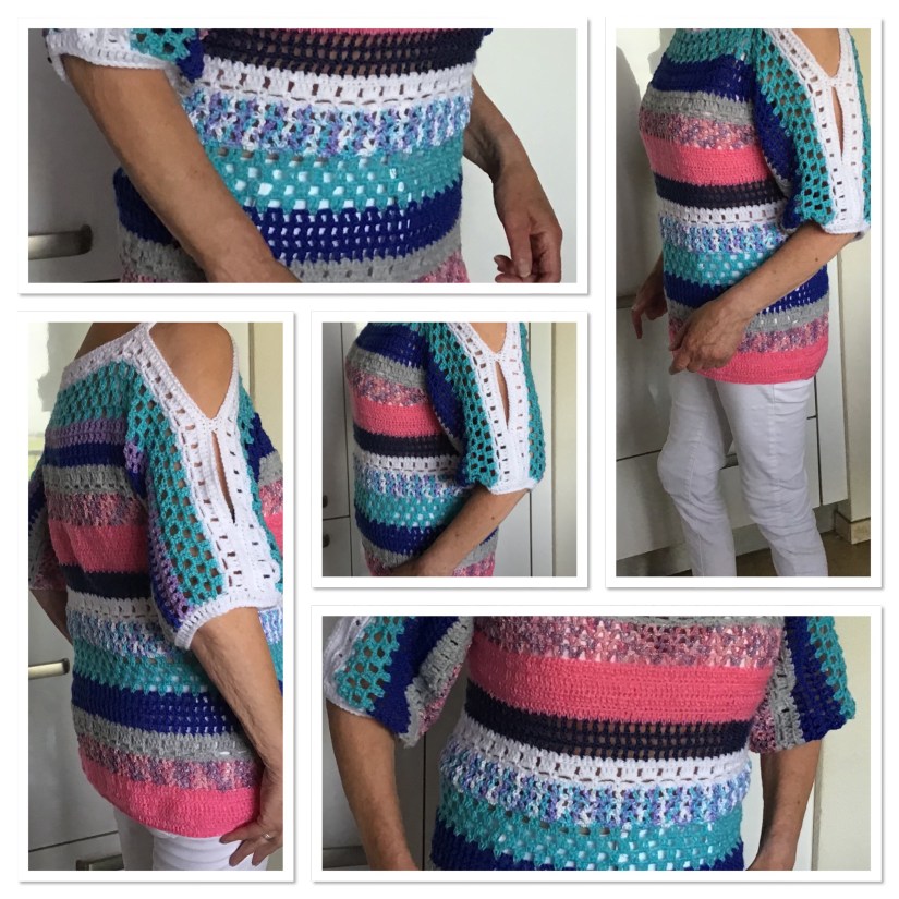Leuke gestreept zomertruitje met veel,verschillende haakpatroontjes. Ideaal om restjes op te maken. Nld 3 1/2. Maten 36/46.