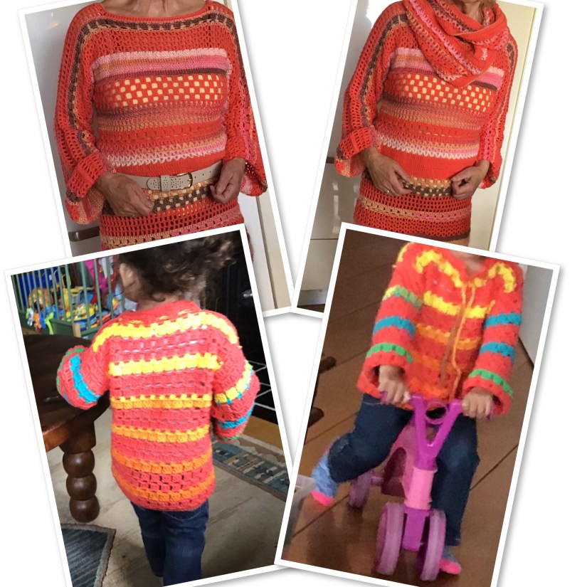 Leuke tuniek/jurk effen garen gecombineerd met verloopgaren in leuke patroontjes. Voor de echte haaksters. Maten 36/46, grotere maten op aanvraag. Leuk met de extra colsjaal. Staat ook in het patroon. Prijs patroon 2,50. kinderpatroon is apart verkrijgbaar.