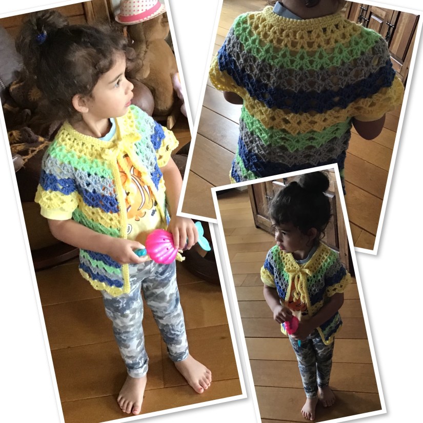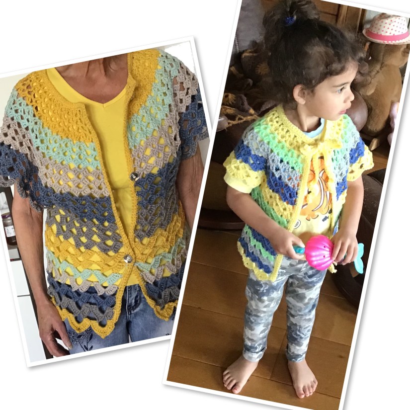 Vestje voor oma en dochter. Top-down gehaakt, eenvoudig patroon. Gemaakt met Glitter Cake van de Action. 3 bollen voor het damespatroon, het meisjesvestje van de restjes. Voor grotere maten een bol meer. Eva van de Wibra is ook goed geschikt.