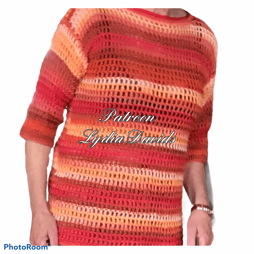 Leuke trui in gaatjespatroon, heel simpel, 1 stokje 1 losse. Het leuke garen doet de rest. Door het kleurverloop vallen de strepen er vanzelf in. Gebruikt is Variety van de Action, maar Fenna van de Wibra of Kelly van de Zeeman kan ook prima. Reken op 4 bollen. Haaknaald 4.