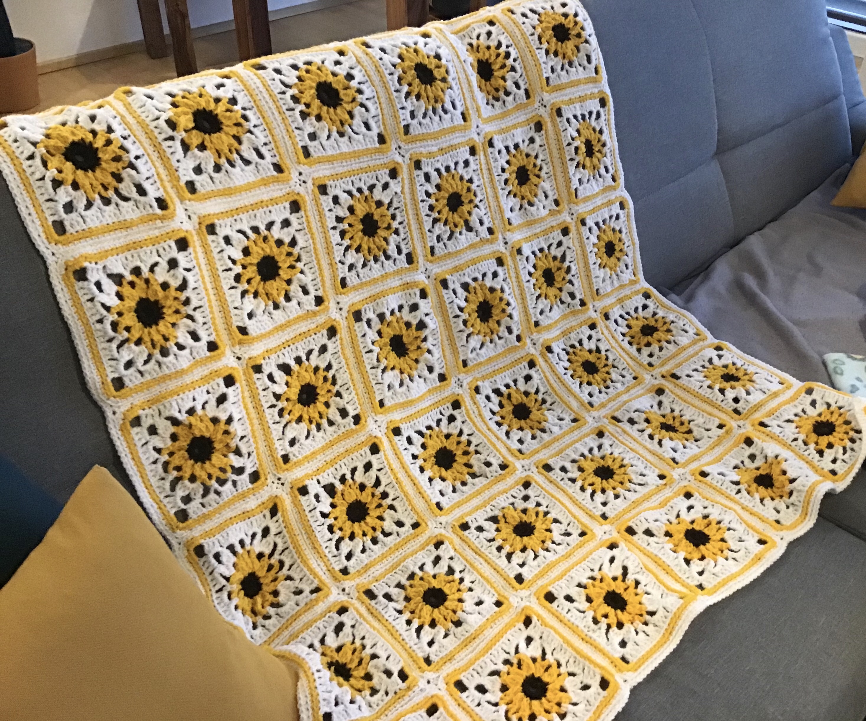 Het dekentje bestaat uit redelijk eenvoudige vierkantjes. Ik heb het gehaakt voor een ledikantje, 6 bij 8 vierkantjes.