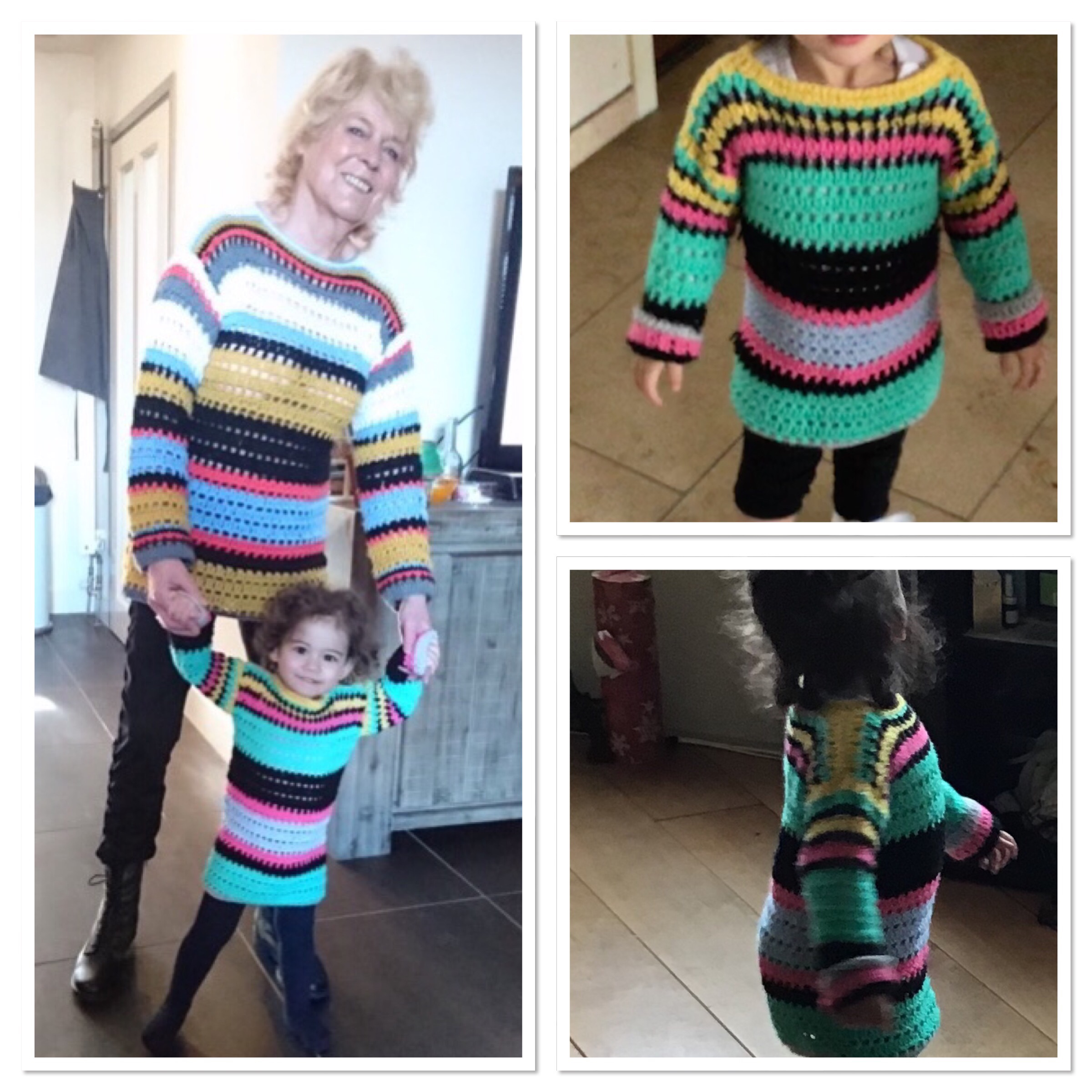 Leuke truien gehaakt van restjes op Nld 4. Damesmaten 36/46, kindermaten 86/104. Grotere maten op aanvraag.