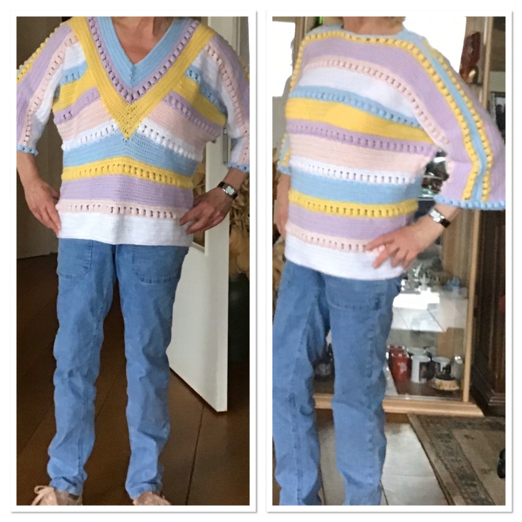 Heerlijke voorjaarstrui, gehaakt met Supersoft van de Zeeman. Voor de kleinste maat had ik 5 x 1 1/2 bol nodig. Gehaakt op Nld 3 1/2.