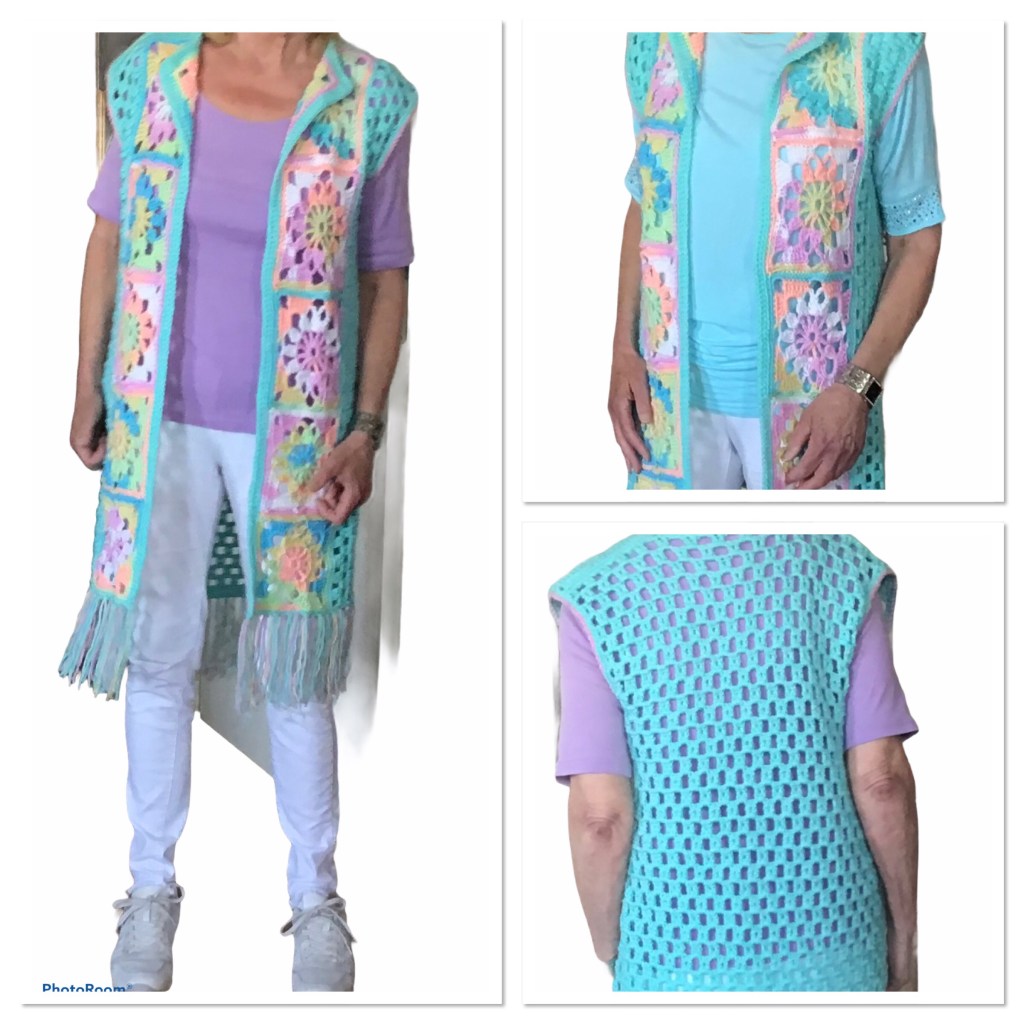 De basis van het vest zijn de vierkantjes. Je kunt zelf bepalen hoe lang je het vest wilt maken door het aantal vierkantjes dat je gebruikt. De beide voorpanden worden in de lengte gehaakt, het rugpand gewoon in de breedte. De steek is heel eenvoudig, hokjes van 2 lossen en 2 stokjes, steeds stokjes op de lege hokjes en 2 lossen boven de stokjes.