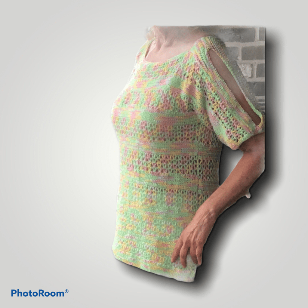 Ik heb dit truitje gehaakt met Mixed Fine van de Action op Nld 3,5. Op de wikkel staat 1,75/2, maar dan wordt het erg stijf. Diverse andere verloopgarens van de Wibra en de Action kan ook, of gewoon effen garen. Let even op de meters. Mixed Fine is 350 m. Ander garen is waarschijnlijk dikker. Volg dan de aanwijzingen voor een maat kleiner. Je hebt 3 a 4 bollen nodig, afhankelijk van de maat en de lengte.
