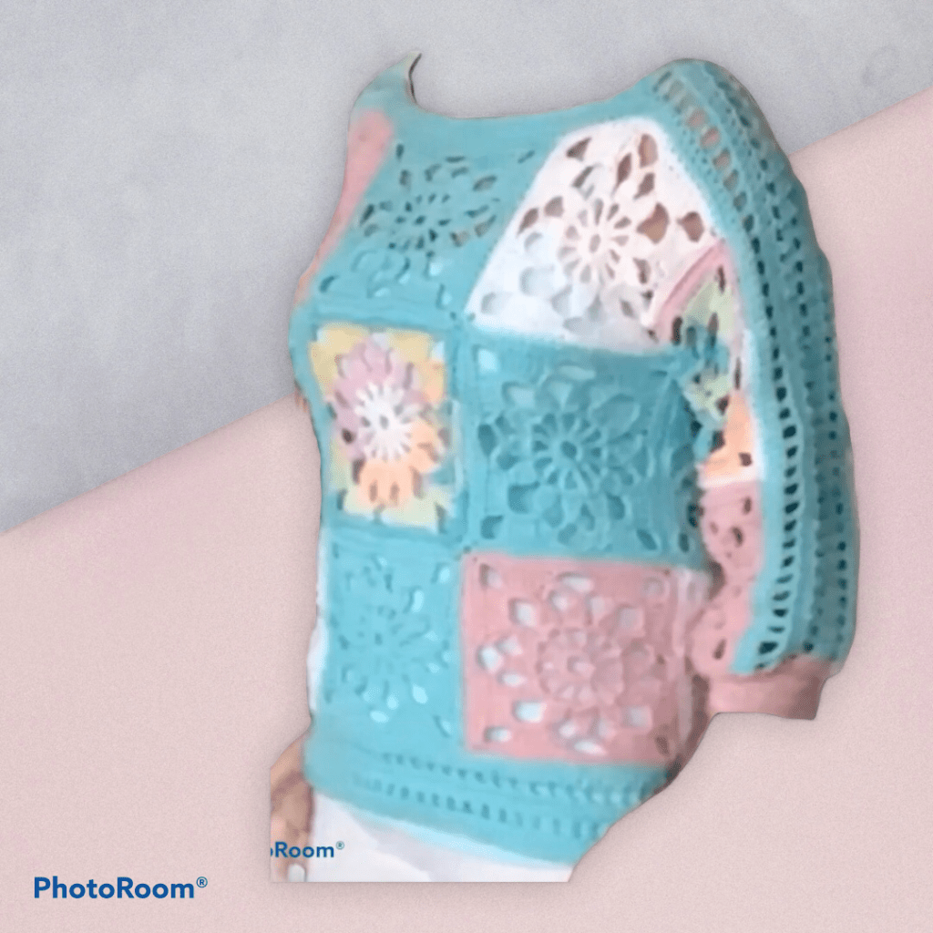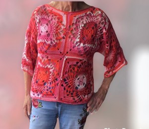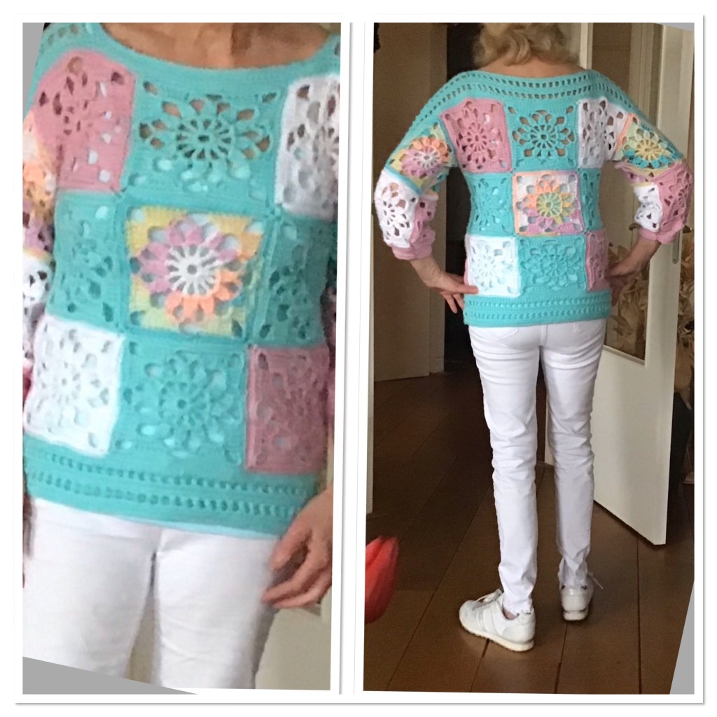 Mooie trui in pastelkleuren. Ik heb deze trui gehaakt met 1 bol van elk Royal Batik, Royal roze, Royal wit en 2 bollen Royal mintgroen met Nld 5. Saskia van de Wibra en Medium van de Action zijn ook geschikt. De trui bestaat hoofdzakelijk uit vierkantjes. Het diagram staat in het patroon en wordt toer voor toer uitgeschreven. De maten zijn 36/38 40/42 44/46. Breedte op de rug 48 52 56 cm.