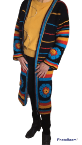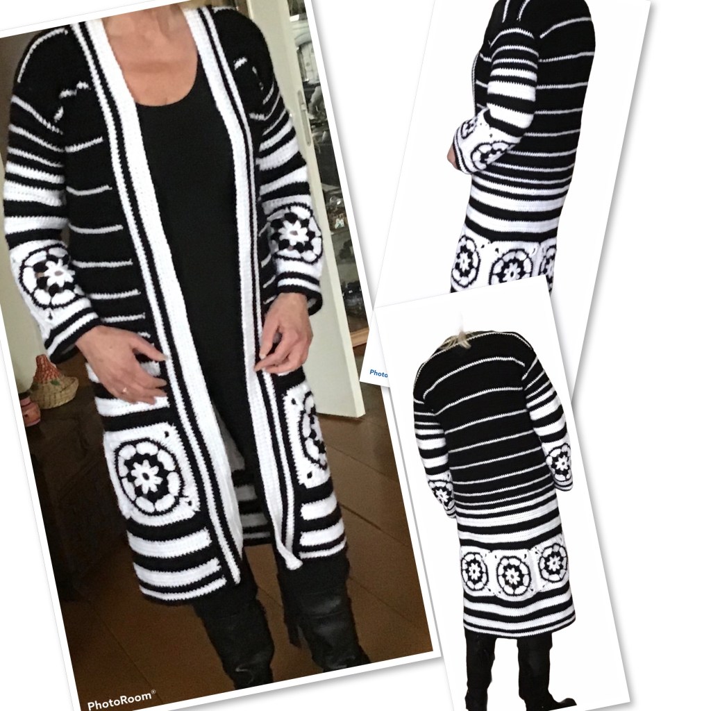 Vest gehaakt met Royal van de Zeeman. Basis zijn de vierkanten, aangevuld met strepen in vasten. T/m maat 54. Saskia van de Wibra en Medium van de Action zijn ook goed geschikt. Je kunt ze ook samen combineren. Voor de grootste maat heb je 5 bollen zwart en 4 bollen wit nodig.