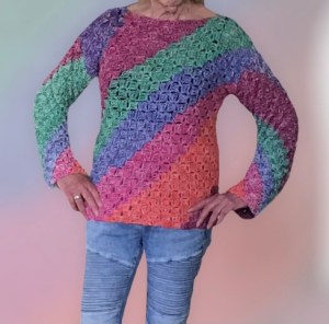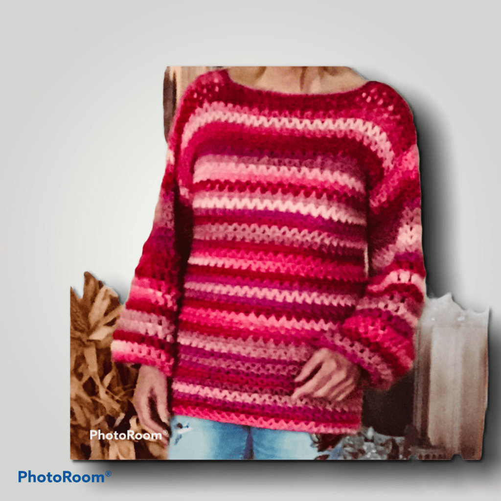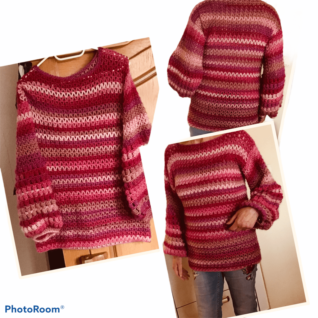 Trui gehaakt met Variety van de Action, maar Fenna van de Wibra of Kelly van de Zeeman kan ook. Gebruikte steken zijn v-steek en noppensteek. Reken op 4 a 5 bollen, afhankelijk van de maat. Maten 36/46. Grotere maten op aanvraag.