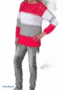 Vast een gezellige trui voor de winter. Gehaakt met 5 bollen Medium van de Action, maar Royal van de Zeeman of Saskia van de Wibra zijn ook goed geschikt. Ze hebben allemaal nieuwe kleuren dit najaar. Materiaalkosten minder dan 5 euro. De maten zijn 36/38 en 40/42 en 44/46. Breedte op de rug ca. 50 54 58 cm.