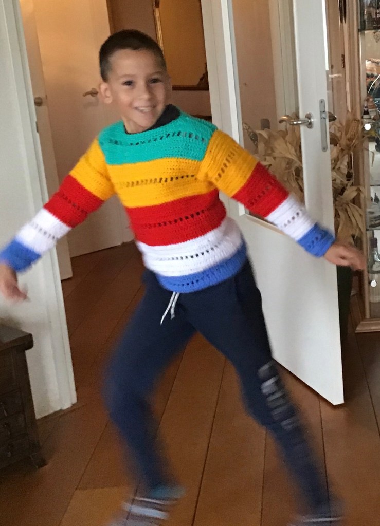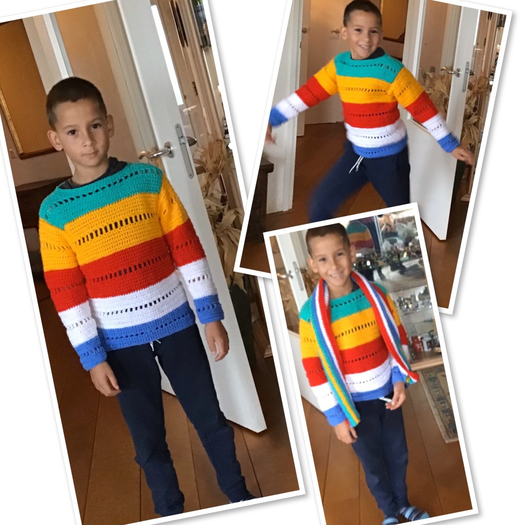 Ik heb deze trui gehaakt op Nld 5 met 5 aangebroken bollen van de Zeeman en de Action, Royal en Medium. Het is een eenvoudig strepenpatroon in 2 maten. Natuurlijk is elke kleurcombinatie mogelijk. Royal, Saskia en Medium zijn prima samen te combineren.