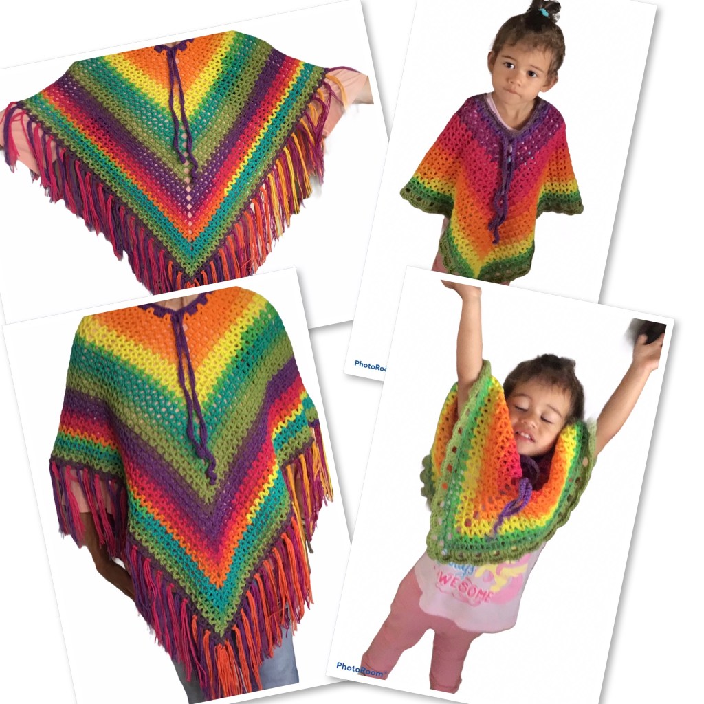 Deze poncho’s zijn heel gemakkelijk te maken. Van bovenaf gehaakt, kunnen dus voor elke maat worden aangepast. Gehaakt in v-steek met 2 resp 1 cakebol Eva van de Wibra, maar ook de Action heeft leuke cakes in verschillende kwaliteiten. Eigenlijk is elk verloopgaren geschikt. Op Nld 4.