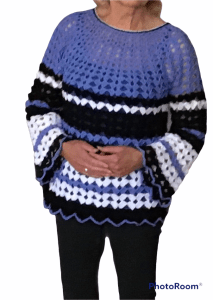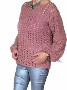 Ik heb deze trui gehaakt met Nld 5 met medium van de Action. Je hebt nodig: 3 bollen roze, 3 bollen zwart. Dit is ook voldoende voor de grotere maten.