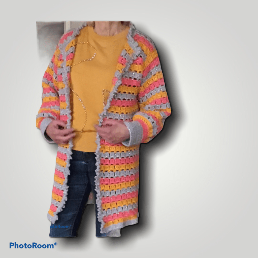Vrolijk of niet? En makkelijk te maken, ook voor beginners. Ik heb dit vest gehaakt met Saskia Lurex van de Wibra op Nld 5. Andere garens die ook goed geschikt zijn: Gewone Saskia van de Wibra, Royal van de Zeeman, Medium van de Action. Je hebt van 3 kleuren elk 3 bollen nodig. Voor de grotere maten zou ik 1 bol extra nemen van de hoofdkleur. Op de foto grijs. Deze kleuren zijn natuurlijk maar een voorbeeld. Zwart wit en grijs zijn erg mooi voor een chique vest.