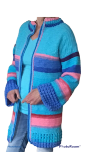 De maten zijn: 36/38 40/42 44/46 48/50 52/54. Breedte op de rug ca. 50 54 58 62 66 cm. Lengte op de foto: ca. 85 87 89 91 91 cm, maar elke lengte is mogelijk. Pas de lengte aan voordat je de splitsing maakt voor de armsgaten.