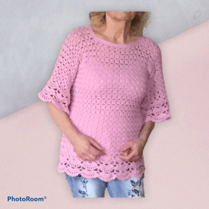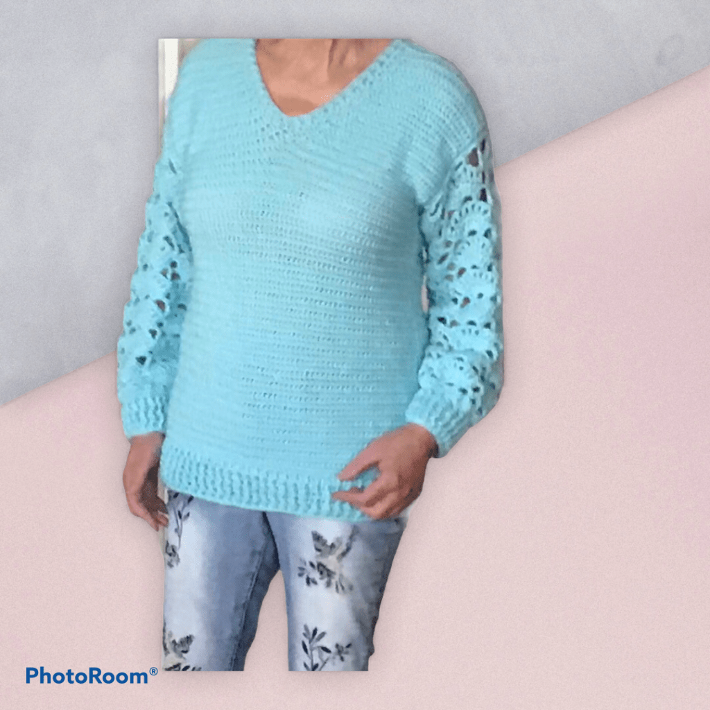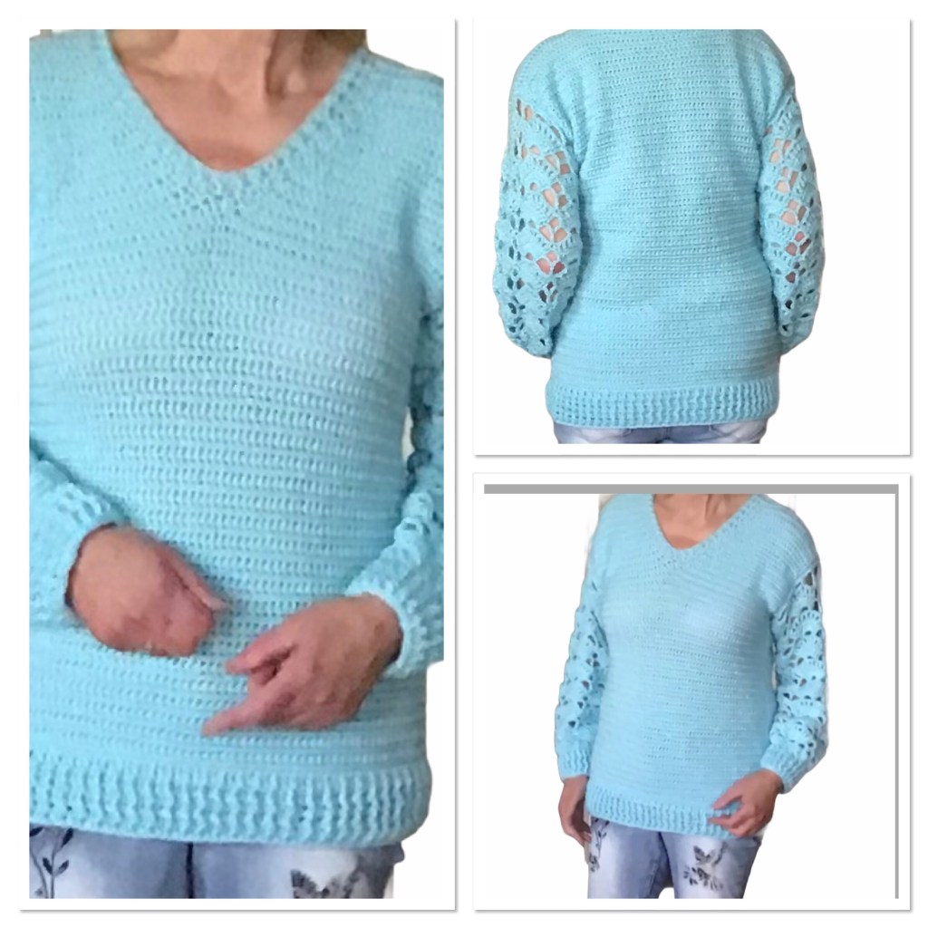 Lekkere warme wintertrui met leuke mouwen. Deze trui is gehaakt op Nld 4,5 met 5 a 6 bollen Medium van de Action, afhankelijk van de maat. Andere geschikte garens zijn: Royal van de Zeeman, Saskia van de Wibra.