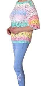 Ik heb dit truitje gehaakt met 6 bollen Supersoft van de Zeeman op Nld 3 1/2. Je kunt ook werken met dunne katoen. Als je gaat haken met dikker garen op Nld 4, neem dan het patroon voor een maat kleiner. Let op de meters: Supersoft is 200 m.