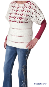 De maten zijn 36/38 40/42 44/46 48/50 52/54. Breedte op de rug 50 55 60 65 70 cm. Dit is de breedte van het blokjesgedeelte. De rand valt breder uit. Even kijken welke patroonmaat het beste bij jou past.
