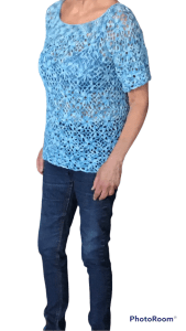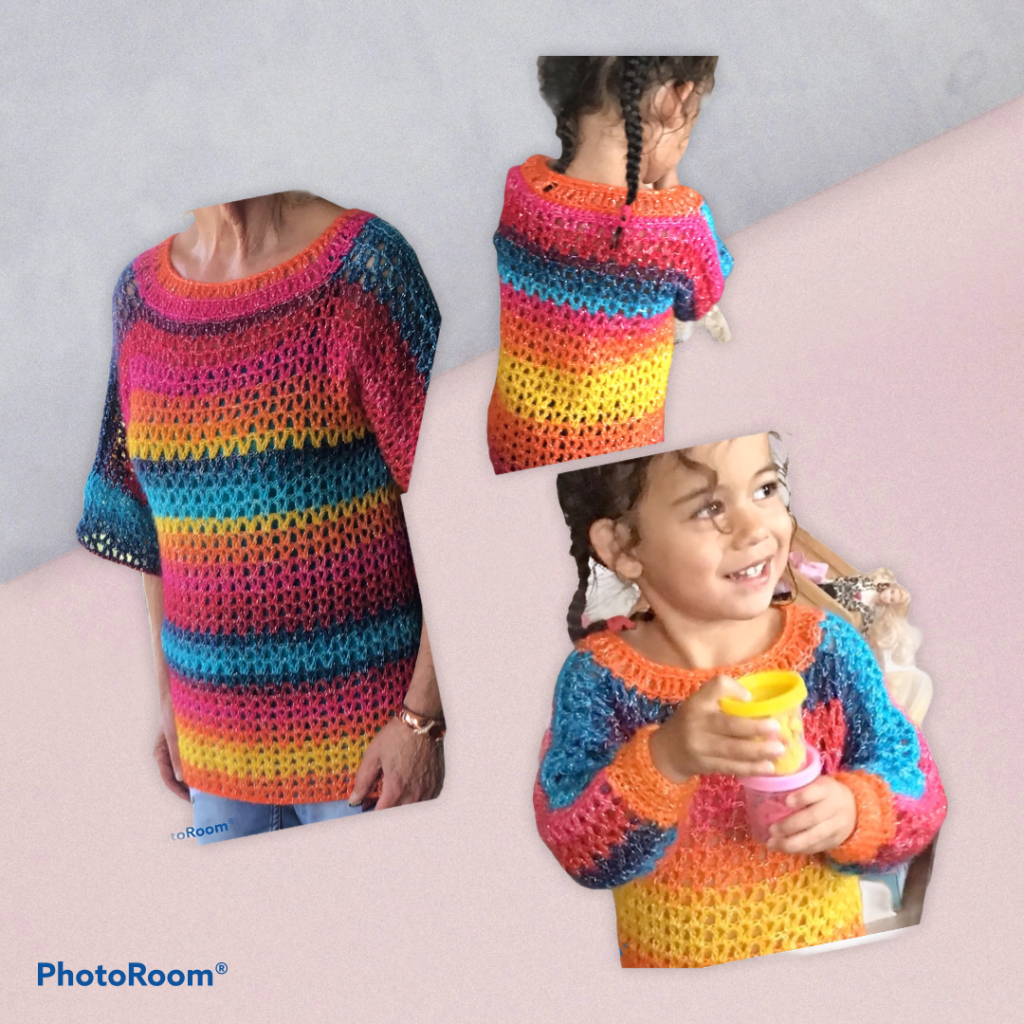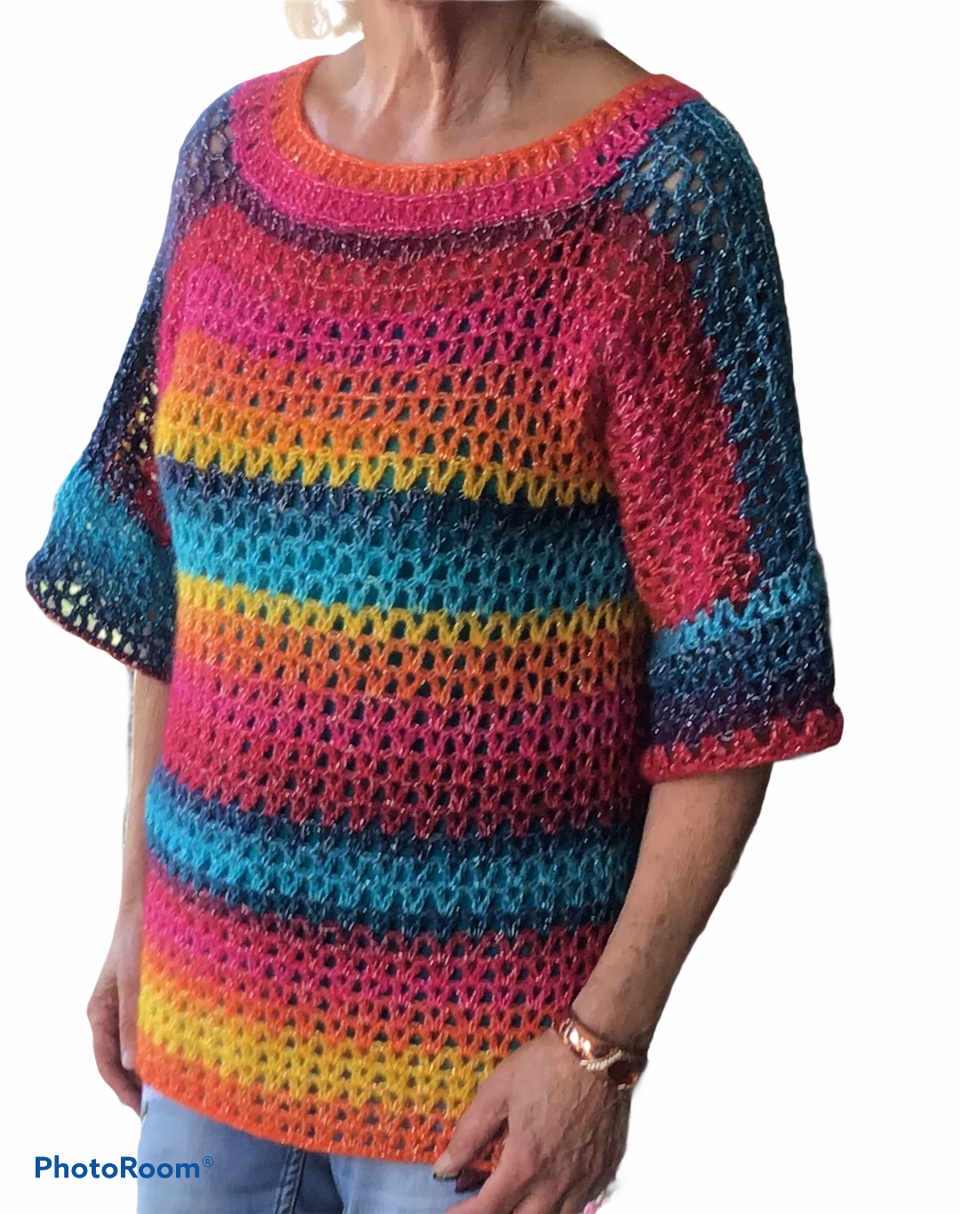 De truien worden rondgehaakt tot aan de armsgaten. Dit is helemaal niet moeilijk en zorgt ervoor dat de kleuren van het verloopgaren mooi doorlopen van voorpand naar achterpand. En nog een voordeel is dat je geen zijnaden hebt. De mouwen worden aan de panden vastgehaakt. Hoef je ook niet meer in te zetten.