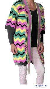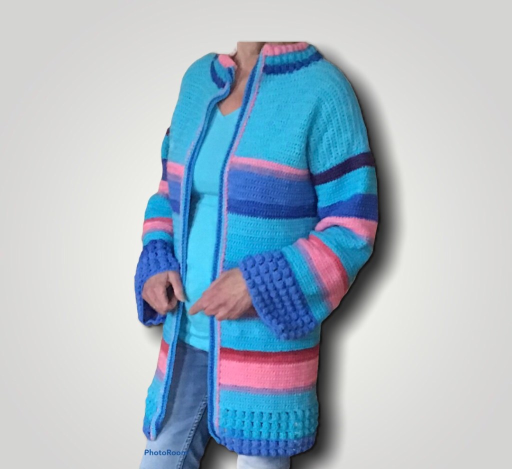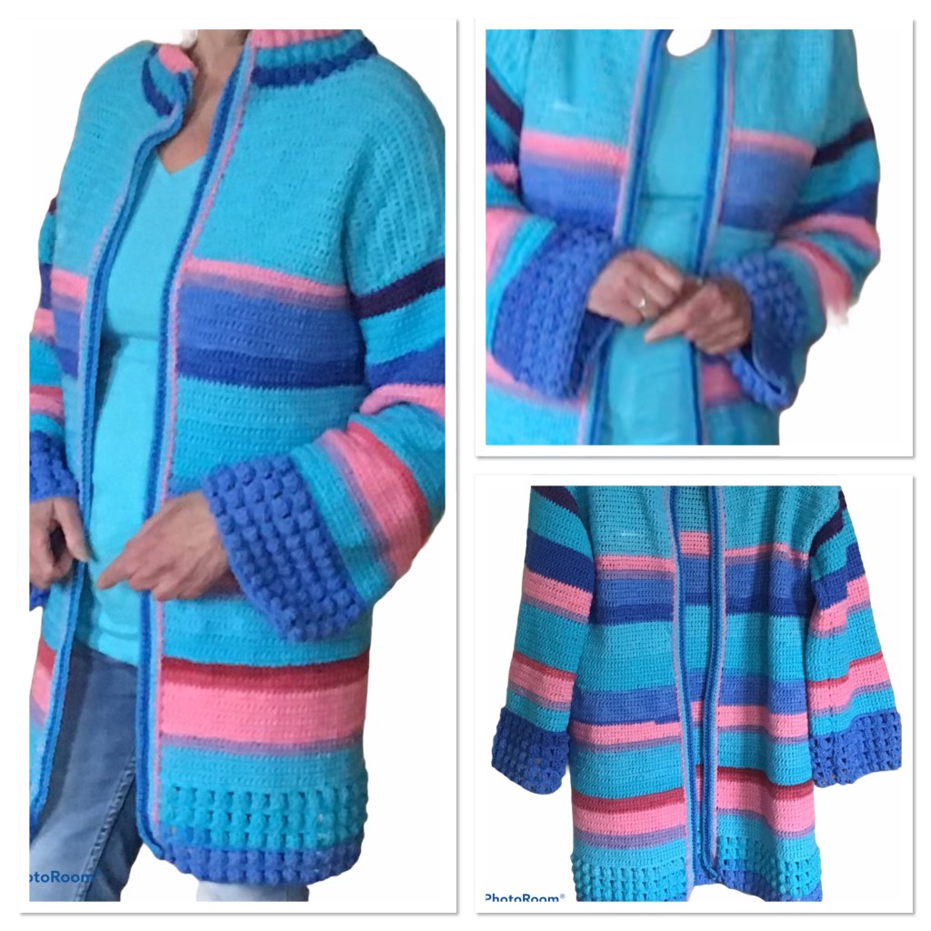 Het blijft geen winter, de dag komt dat een vrolijk vest de plaats gaat innemen van je winterjas. Dit vest is gemaakt met 4 bollen Eva van de Wibra. Recht toe recht aan in vasten, met noppen aan de zoom, mouwen en het opstaand kraagje. Ook goed te doen voor beginnende haaksters. Materiaalkosten 13 euro. Prijs patroon 2,50. Maten 36/58.