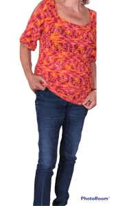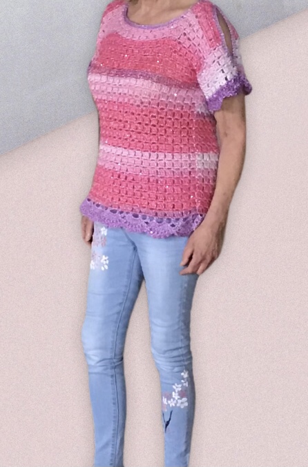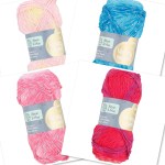 Ik heb dit truitje gehaakt met 5 bollen Variety Sequins van de Action op Nld 3,5. Dit is voldoende voor alle maten, bij de kleinere maten hou je een flinke rest over. Je kunt met elk verloopgaren geschikt voor Nld 3 tot 4 haken, of met katoen. Let wel op de meters, dit garen is 240 m per bol.
