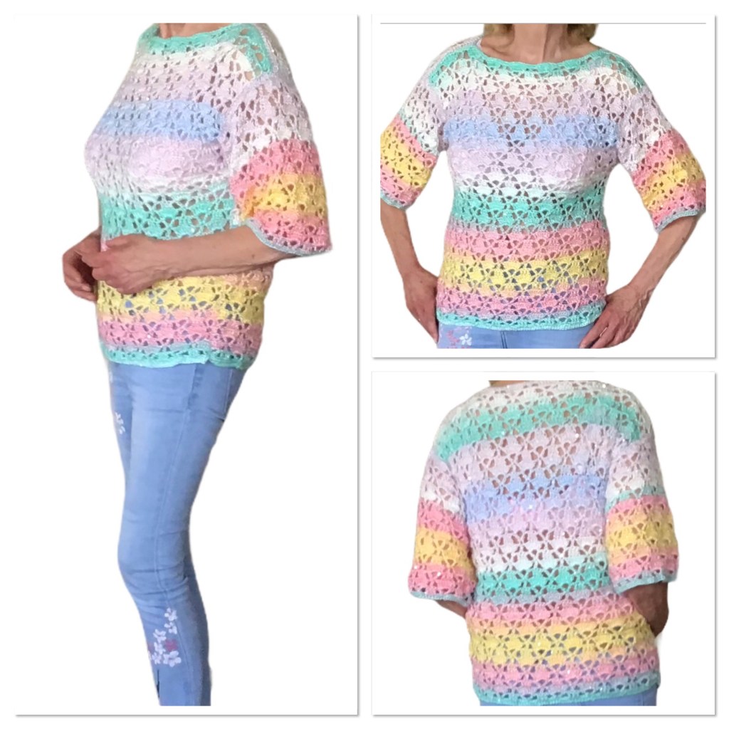 Dit is een leuk patroontje om te doen. Ik heb gehaakt met Nld 3 1/2 met 5 bollen Sequins van de Action. Het is een beetje lastig garen om mee te haken, 2 draden en piepkleine paillettes. Maar het resultaat is echt heel mooi. Je kunt natuurlijk ook met aparte bollen werken, bv 6 of 7 bollen Supersoft van de Zeeman, of dunne katoen. Of helemaal effen in een mooie kleur. Let dan wel op de meters, je hebt 1200tot 1400 m nodig, afhankelijk van de maat.