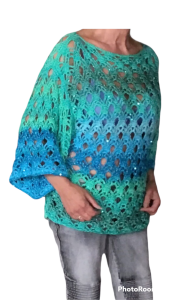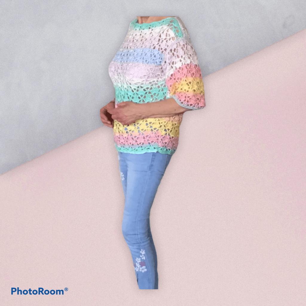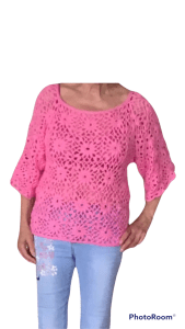 De trui bestaat uit rechte lappen. De maten zijn 36/38 40/42 44/46 48/50 52/54 Breedte ongeveer 50 54 58 62 66 cm.