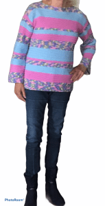 Deze trui is in de lengte gehaakt op Nld 4,5 met 5 a 6 bollen (afhankelijk van de maat) Royal Batik van de Zeeman. Als je erg vast haakt zou ik nld 5 nemen. Het is een eenvoudig model, heel geschikt voor beginners. Alleen rechte lappen haken in vasten.