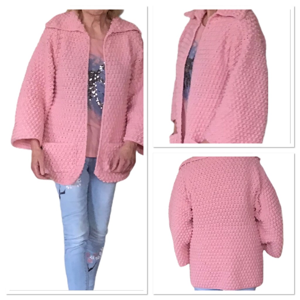 Dit warme jasje wordt helemaal in kleine nopjes gehaakt en is daardoor lekker dik en warm. Het voelt een beetje als een teddyjasje. Je hebt 8 bollen nodig. Royal van de Zeeman, Saskia van de Wibra, Medium van de Action, allemaal goed. Nld 5,5. Voor de grootste maten kun je misschien voor alle zekerheid een bol extra nemen.