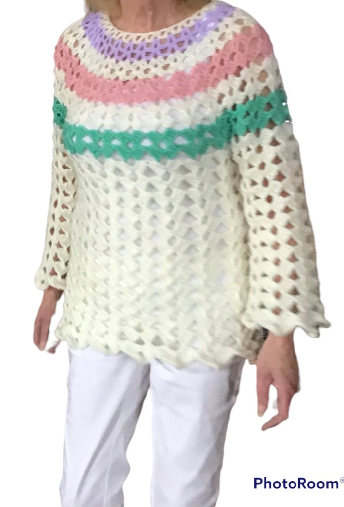 Top-down gehaakte trui. Helemaal rondgehaakt, dus geen naden en de strepen lopen mooi door. Gehaakt met Nld 5.