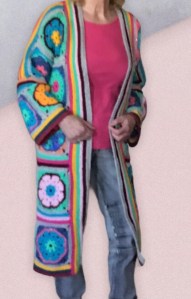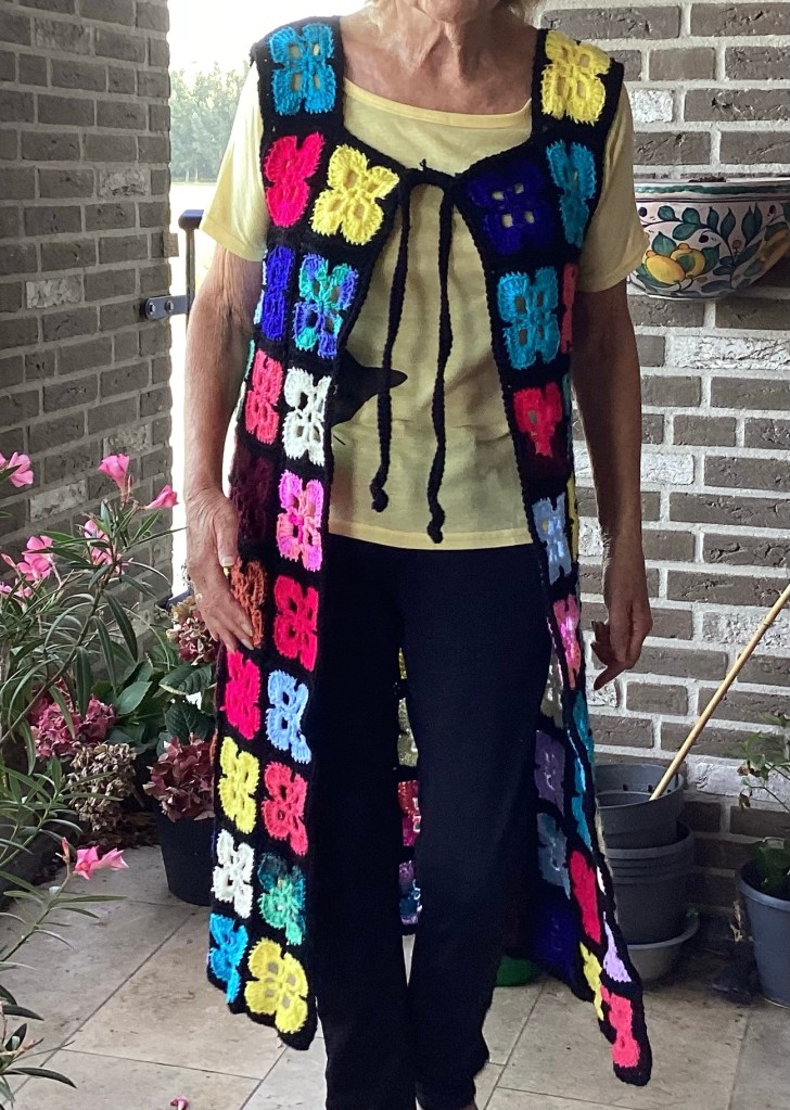 Dit vest is gemaakt met 2 bollen hoofdkleur en verder heel veel restjes. Zelfs van een klein bolletje kun je al meerdere vierkantjes haken. Materiaal is hoofdzakelijk Royal van de Zeeman, Saskia van de Wibra en medium van de Action. Alle garen voor Nld 5 is geschikt.