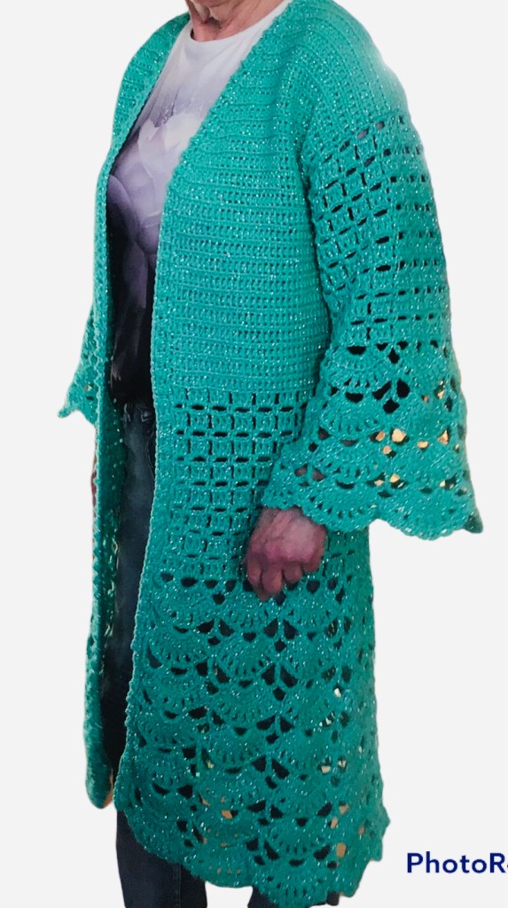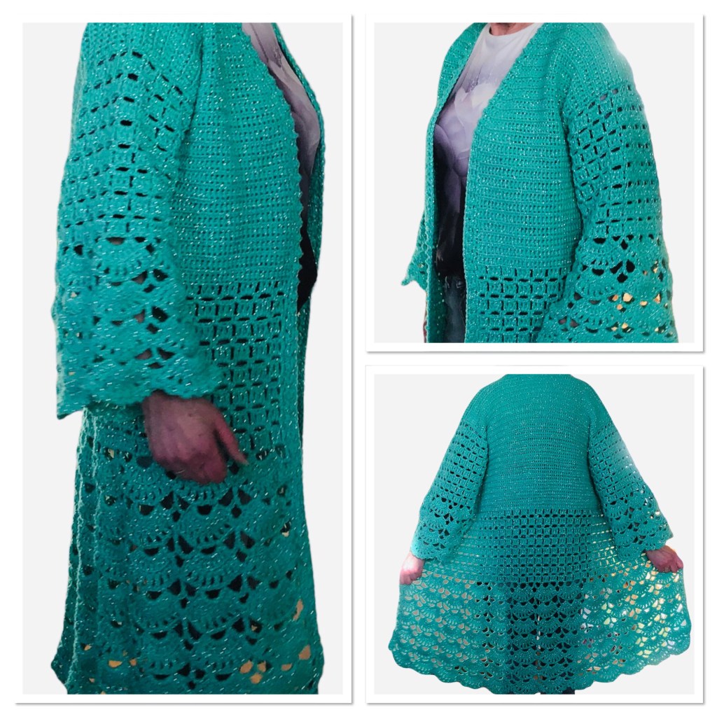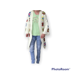 Ik heb dit vest gehaakt met 7 bollen Saskia Lurex van de Wibra op Nld 5. Je kunt ook werken met gewone Saskia van de Wibra, Royal van de Zeeman of Medium van de Action. De maten zijn 36/38 40/42 44/46 48/50 52/54.