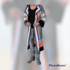 De maten zijn 36/38 40/44 46/52. Breedte op de rug 50 60 60 cm. Lengte is 1.00 a 1.05 m, afhankelijk van de maat. Het vest kan eventueel langer of korter gemaakt worden.