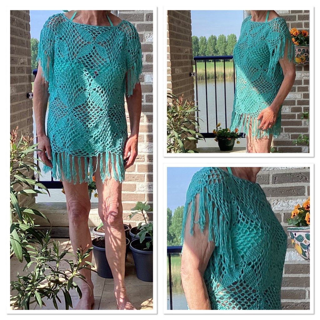 Je kunt dit strandjurkje haken met elk garen geschikt voor Nld 4/4,5. Het bestaat helemaal uit vierkantjes. Haakschema met uitgeschreven toeren in het patroon. Je hebt ongeveer 1000/1200 m nodig, afhankelijk van de maat.