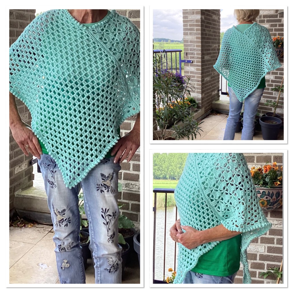 De poncho is gehaakt met 4 bollen Royal van de Zeeman op Nld 4,5. Als je vast haakt Nld 5 nemen.