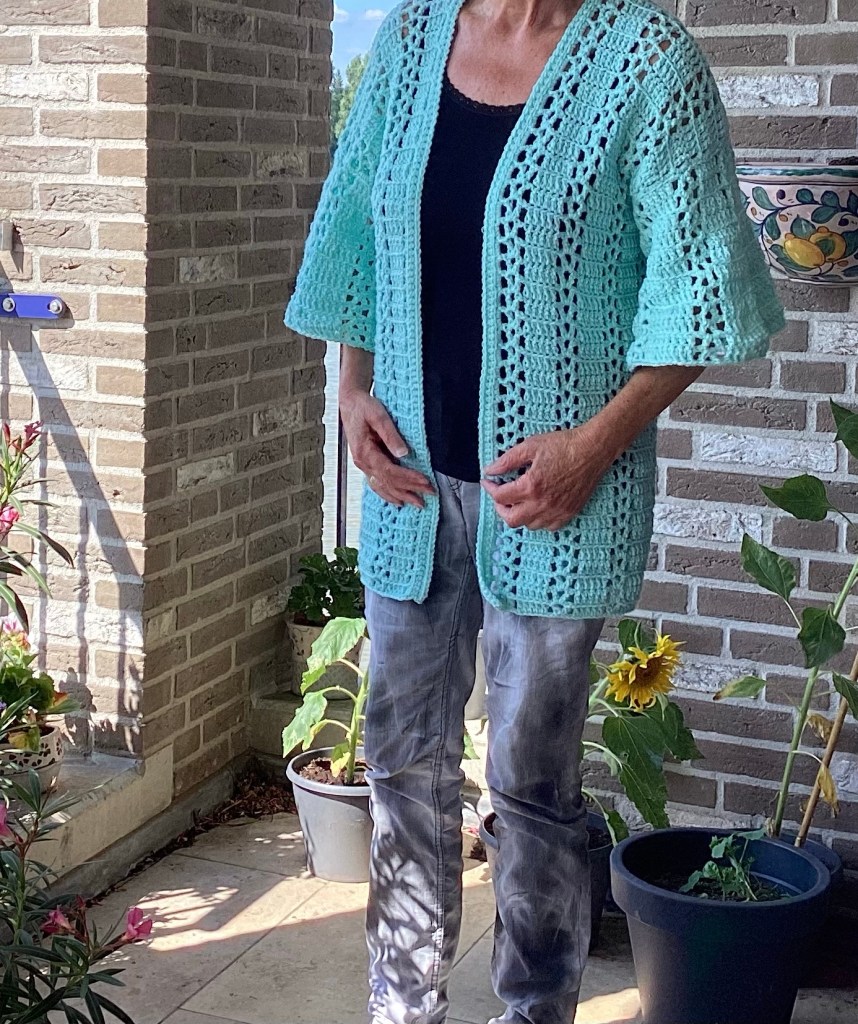 Het vest wordt tot de armsgaten aan elkaar gehaakt. Je bepaalt zelf de lengte: heupvest, halverwege de dijen, over de knie, kuitlengte, allemaal mogelijk. Als je het vest echt langer gaat maken, reken dan op 1 a 2 bollen extra.