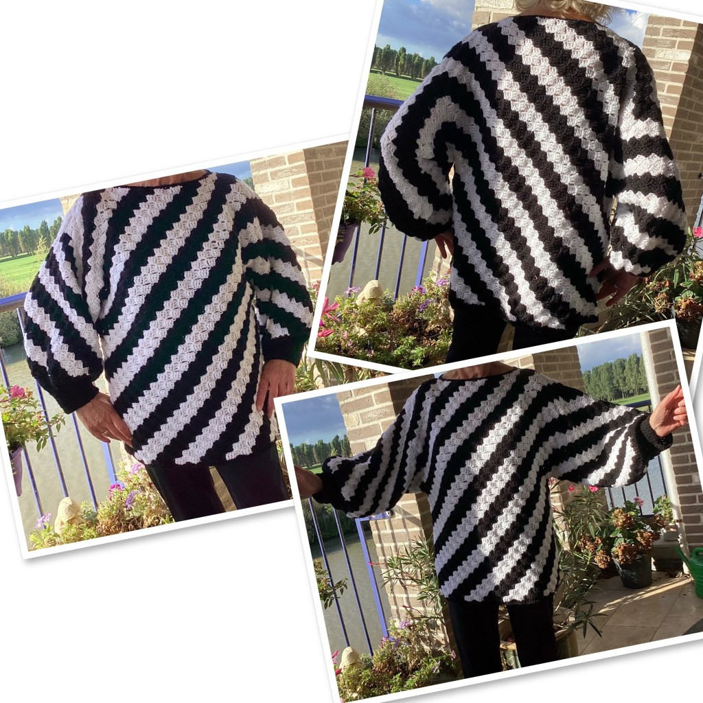 Nog nooit corner to corner (c2c) gehaakt? Gewoon proberen, leuk om te doen en schiet goed op. Ik heb deze trui gehaakt op Nld 3,5 met Supersoft van de Zeeman, 3 bollen wit, 3 bollen zwart. Voor de grootste maat 1 bol per kleur extra nemen. Je kunt ook met dikker garen werken, neem dan een maat kleiner.