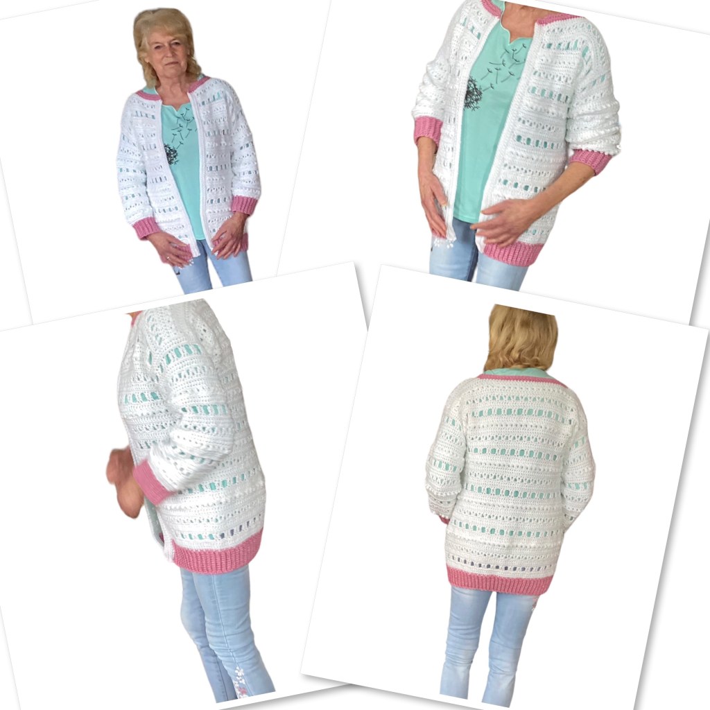 De maten zijn 36/38 40/42 44/46 48/50 52/54. Breedte op de rug ongeveer 50 54 58 62 66 cm. Aanwijzingen staan altijd in deze volgorde. Lengte kun je zelf bepalen.