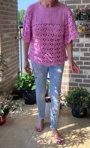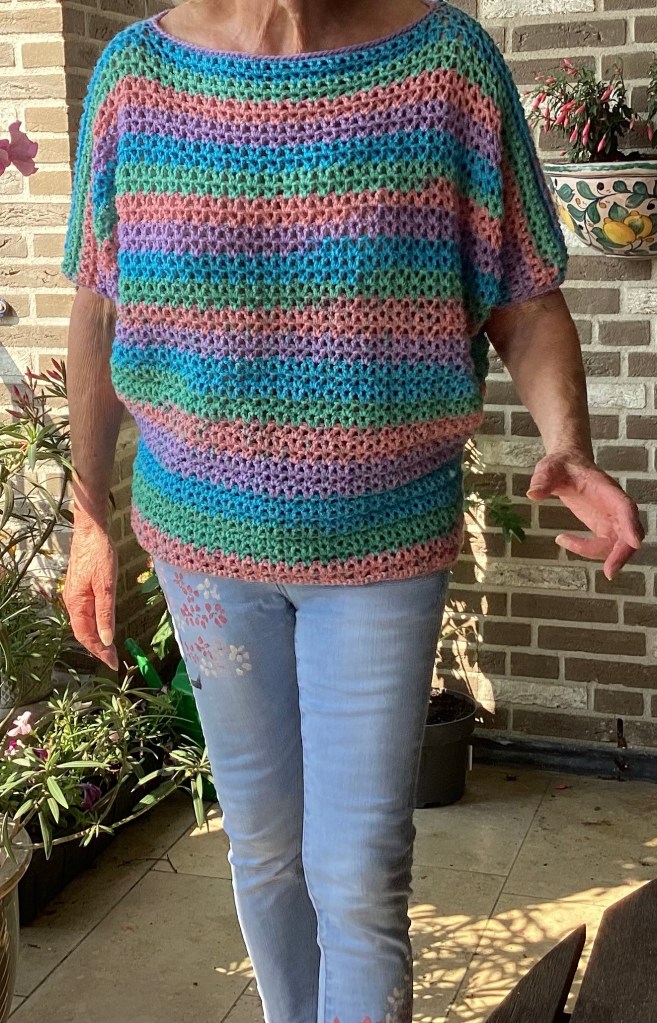 Ik heb dit truitje gehaakt met 3 bollen Sundae van de Action op Nld 4. Het patroon is makkelijk, alleen vtjes haken en een beetje meerderen. Je kunt natuurlijk ook met dunne katoen of elk ander garen geschikt voor Nld 4 werken. Let dan wel op de meters: je hebt 1100-1300 m nodig, afhankelijk van de maat.