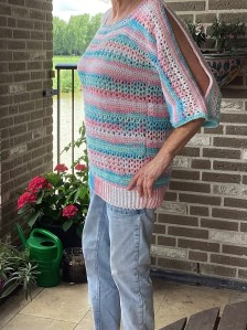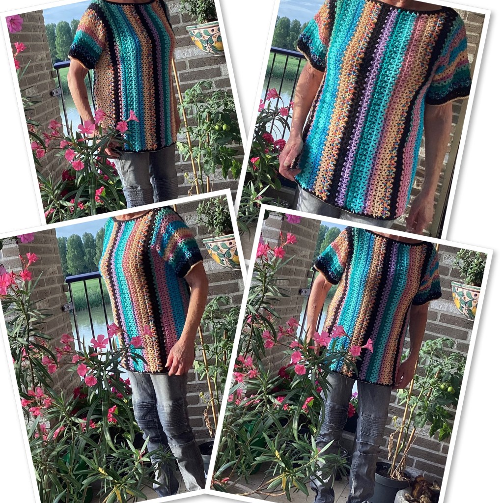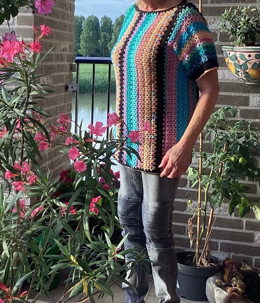 Dit is echt een makkelijk patroon. Als je stokjes kunt haken, kun je dit truitje maken, alleen rechte stukken haken. Ik heb gewerkt met restjes op Nld 3,5, maar je kunt natuurlijk ook gewoon gekleurde bollen kopen. Alle garen geschikt voor Nld 3,5/4, of dunne katoen natuurlijk, kun je gebruiken. Je hebt ongeveer 1000 tot 1200 m nodig, afhankelijk van de maat.